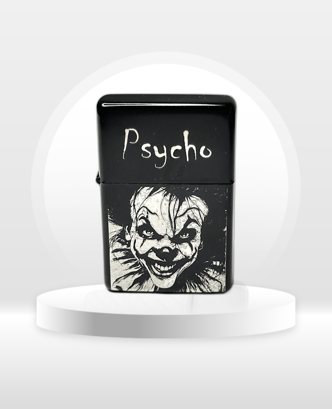 Betreten Sie die dunkle und mysteriöse Welt des "Psycho Clown Flame" Benzinfeuerzeugs! Dieses außergewöhnliche Feuerzeug ist nicht nur ein funktionales Accessoire, sondern ein fesselndes Kunstwerk. Der diabolisch grinsende Clown, der in lebhaften Details eingraviert ist, strahlt eine unheimliche und faszinierende Aura aus. Der handgeschriebene Schriftzug „Psycho“ verstärkt die düstere Atmosphäre und macht dieses Feuerzeug zu einem echten Blickfang.