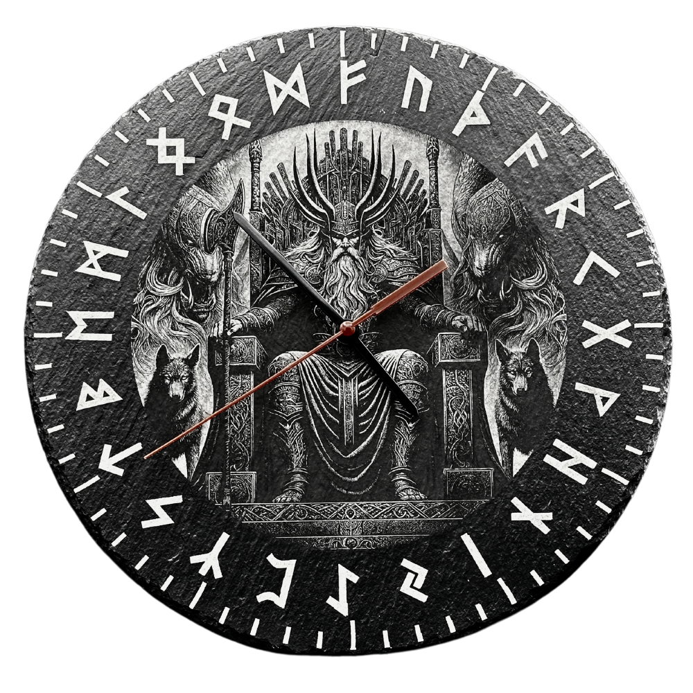 Erleben Sie die Faszination der nordischen Mythologie mit unserer exklusiven Wikingeruhr aus Naturschiefer. Diese Wanduhr zeichnet sich durch eine kunstvolle Darstellung von Odin, dem Allvater der nordischen Götter, aus. Umgeben von mystischen Runen, die in den dunklen Schiefer graviert sind, fügt sich diese Uhr nahtlos in jedes Ambiente ein, das von historischer Mystik und Eleganz geprägt ist.